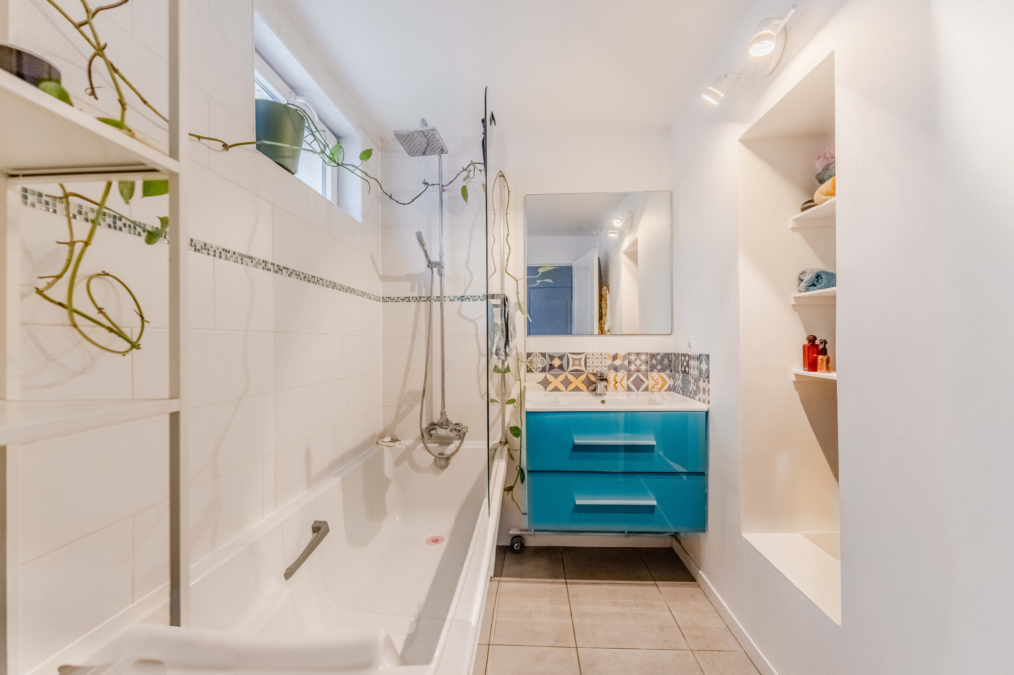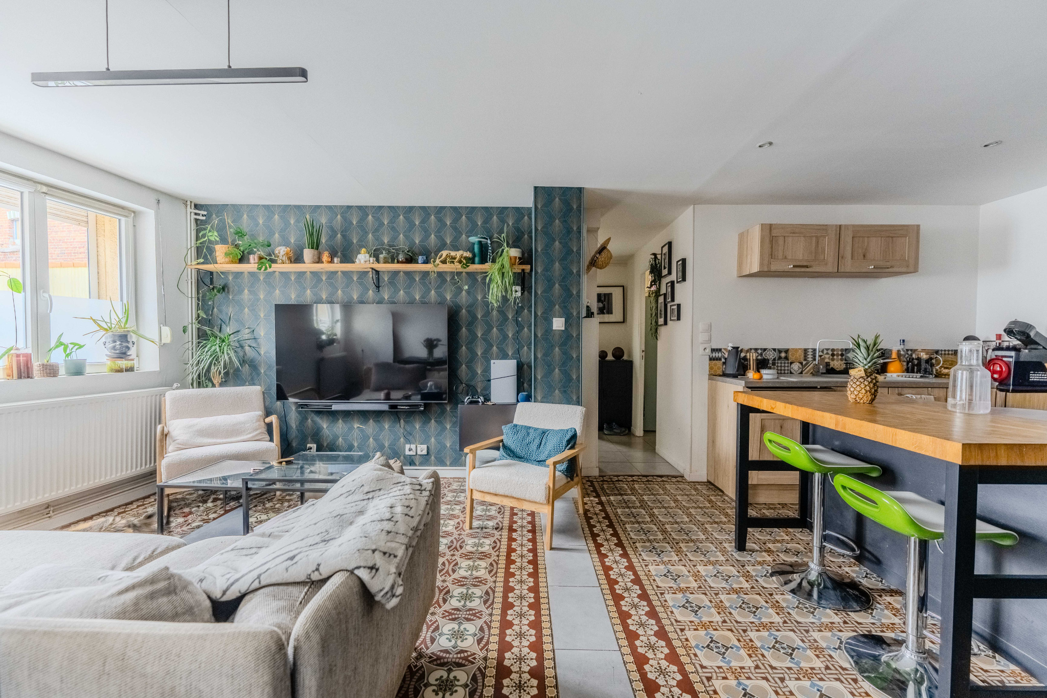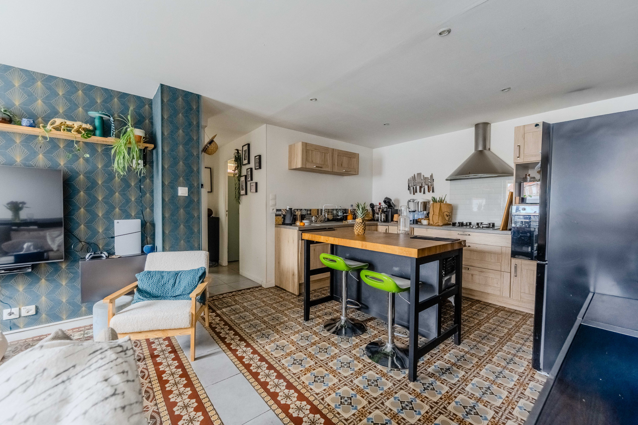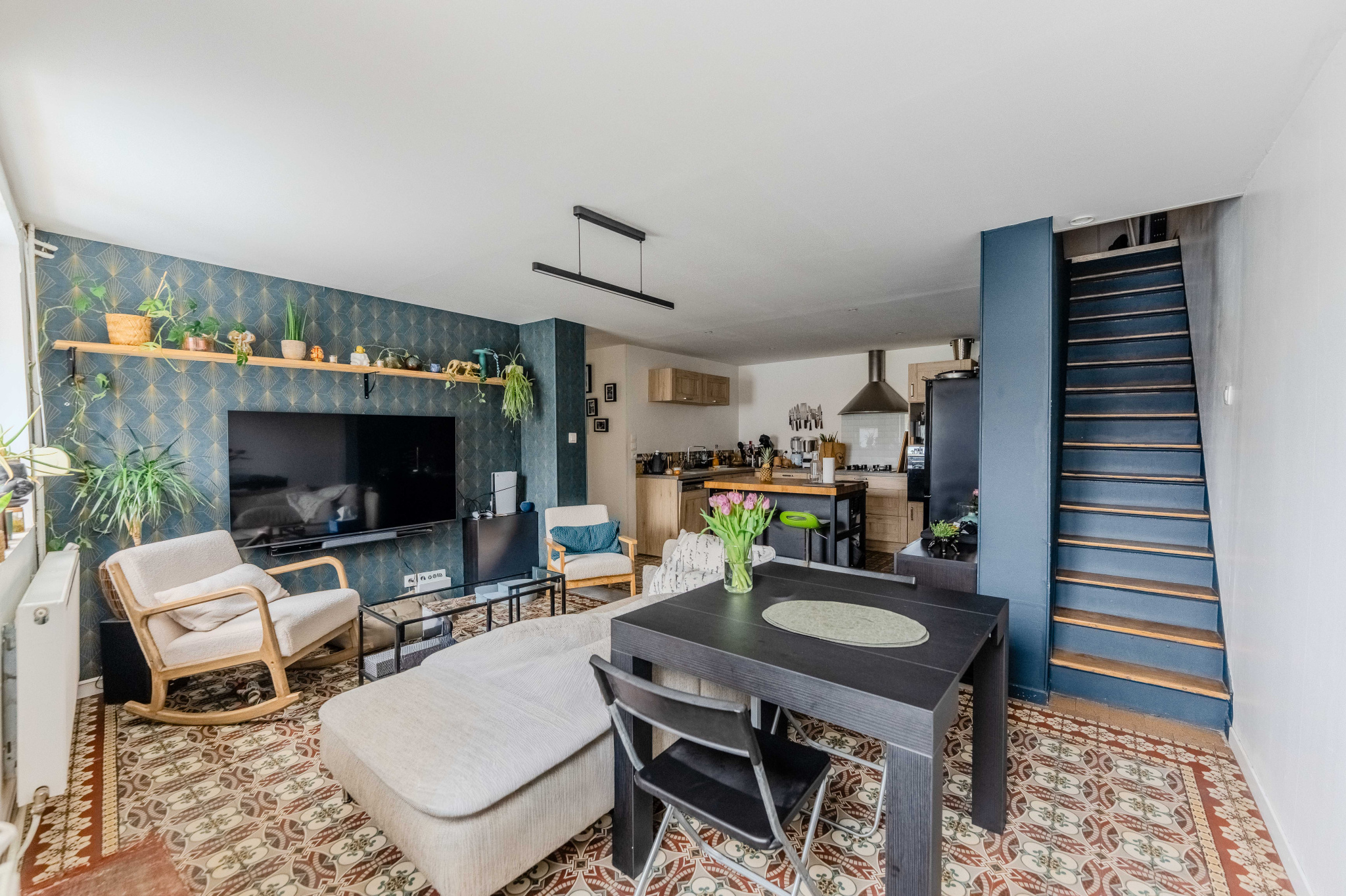 Elle se compose d’une entrée desservant un espace de vie chaleureux avec cuisine ouverte et carrelage ancien, un espace buanderie, une salle de bain et un wc séparé.