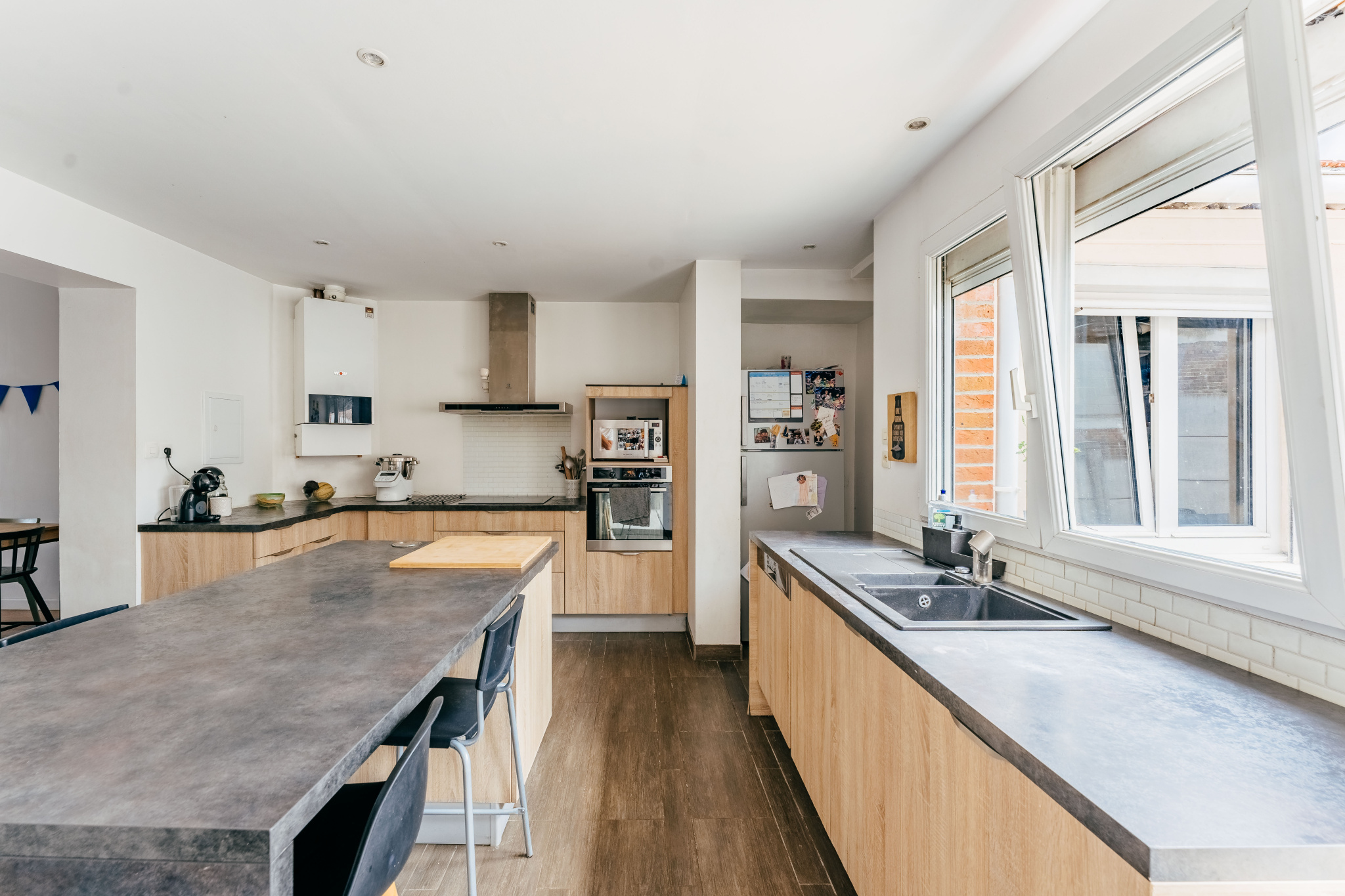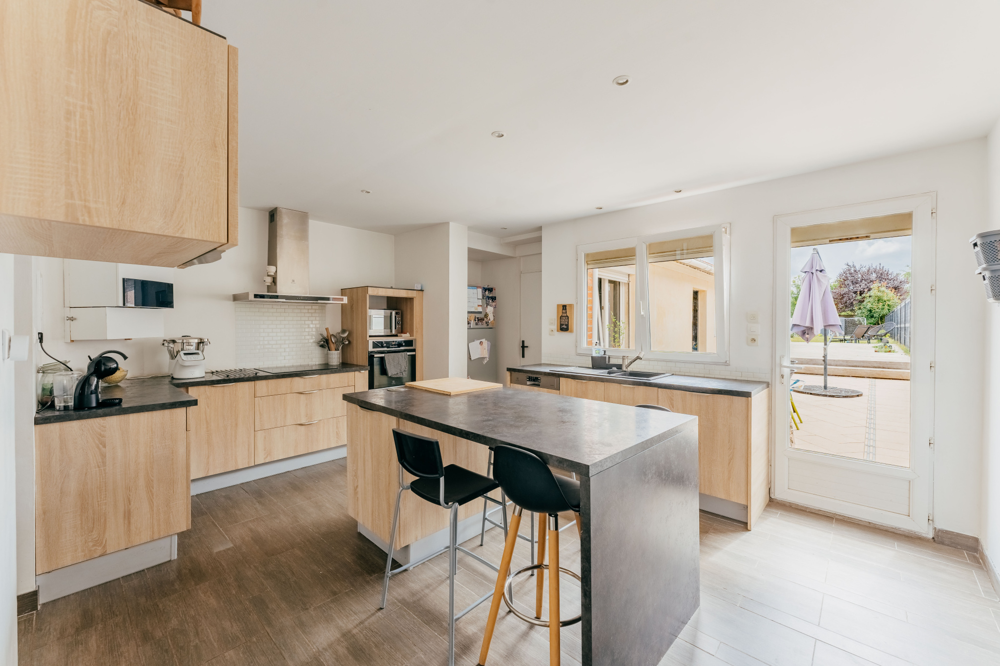 Vous y découvrirez une entrée desservant un séjour spacieux et chaleureux, une cuisine équipée lumineuse avec îlot central donnant sur le jardin, une buanderie et un wc séparé.