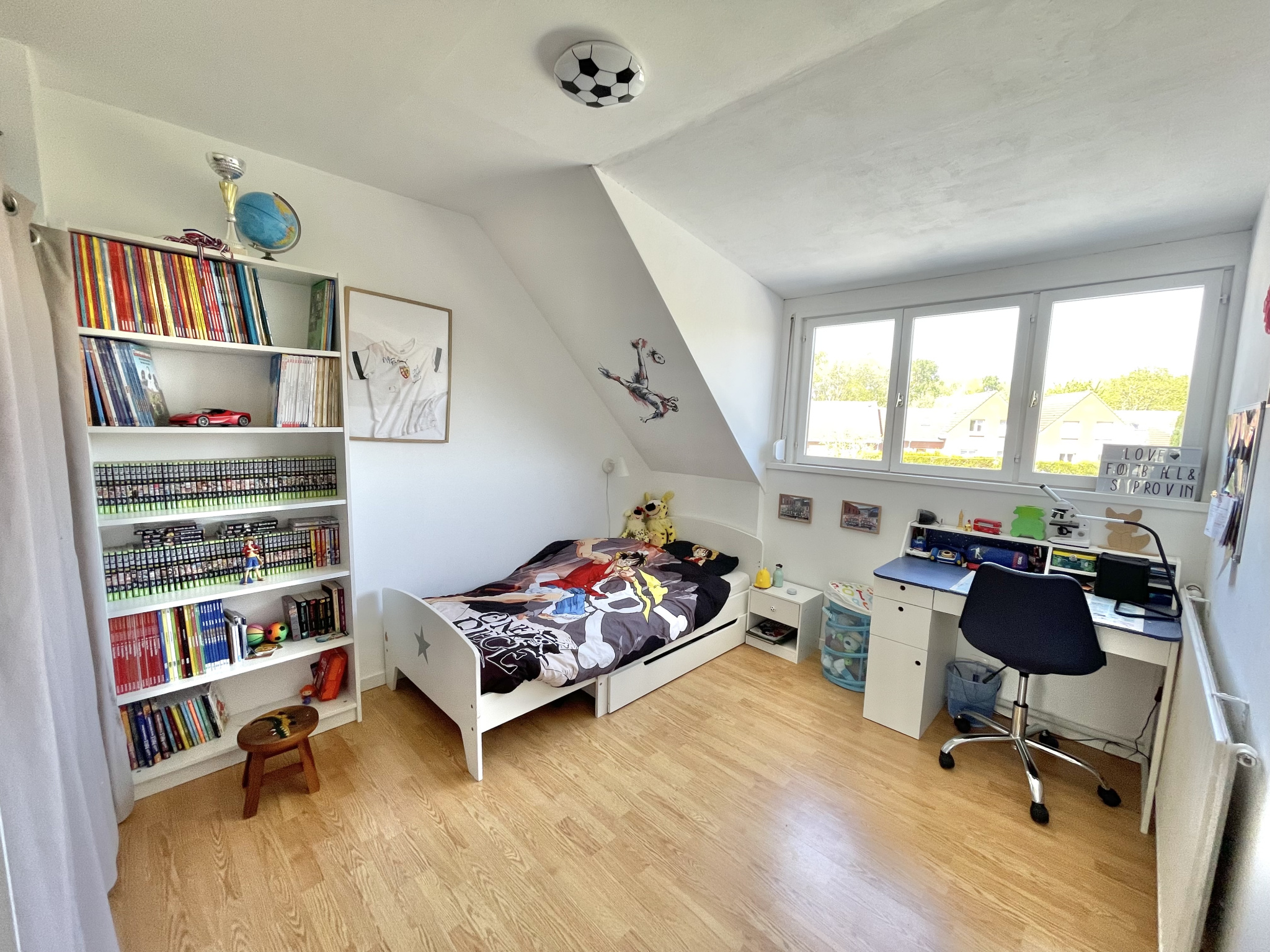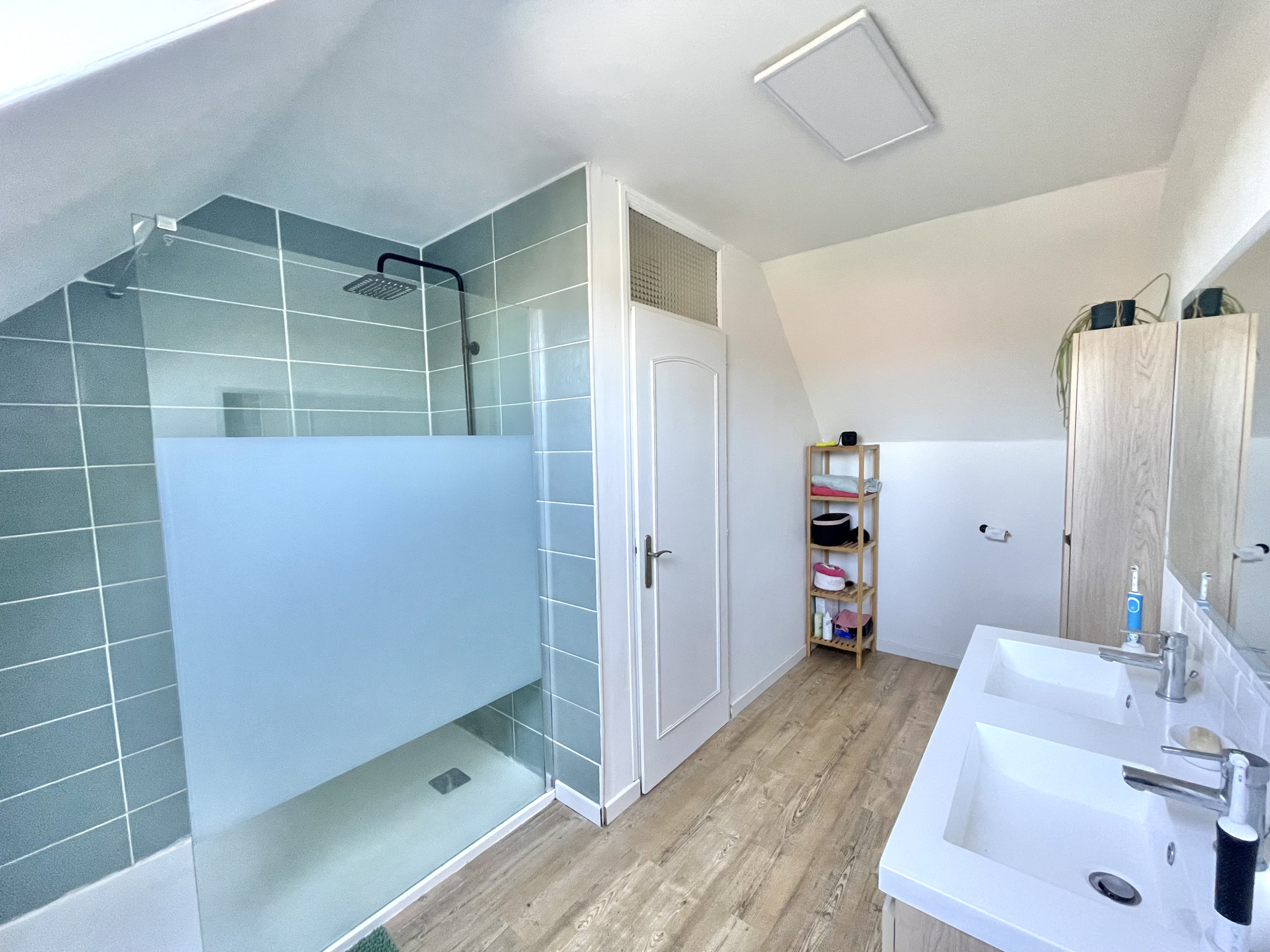A l’étage, vous découvrirez 3 chambres sur le même pallier ainsi qu’une salle de bain avec douche à l’italienne, double vasque et un second WC.